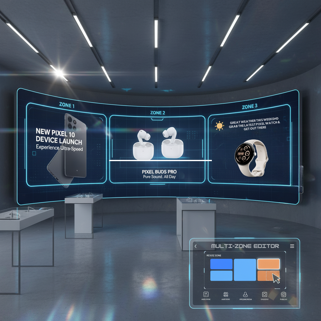 Use a WYSIWYG editor to split screens into multiple zones (split an extended LED display into 3 distinct zones)